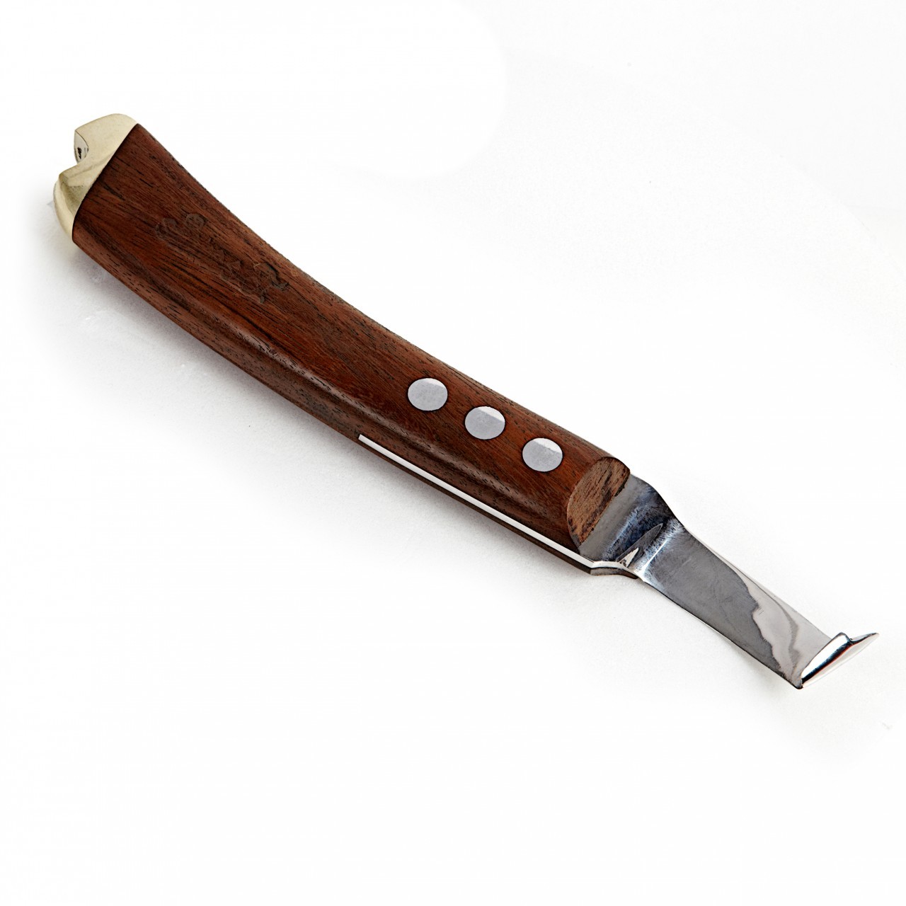 There are a number of options – curved and wide blade knives with a brass topper and loop knife options including small and large loops incorporating the Beanie Flick groover – used as a clench groover. That is, for digging a small groove in the dorsal hoof wall so the nail can clench tightly into the hoof.